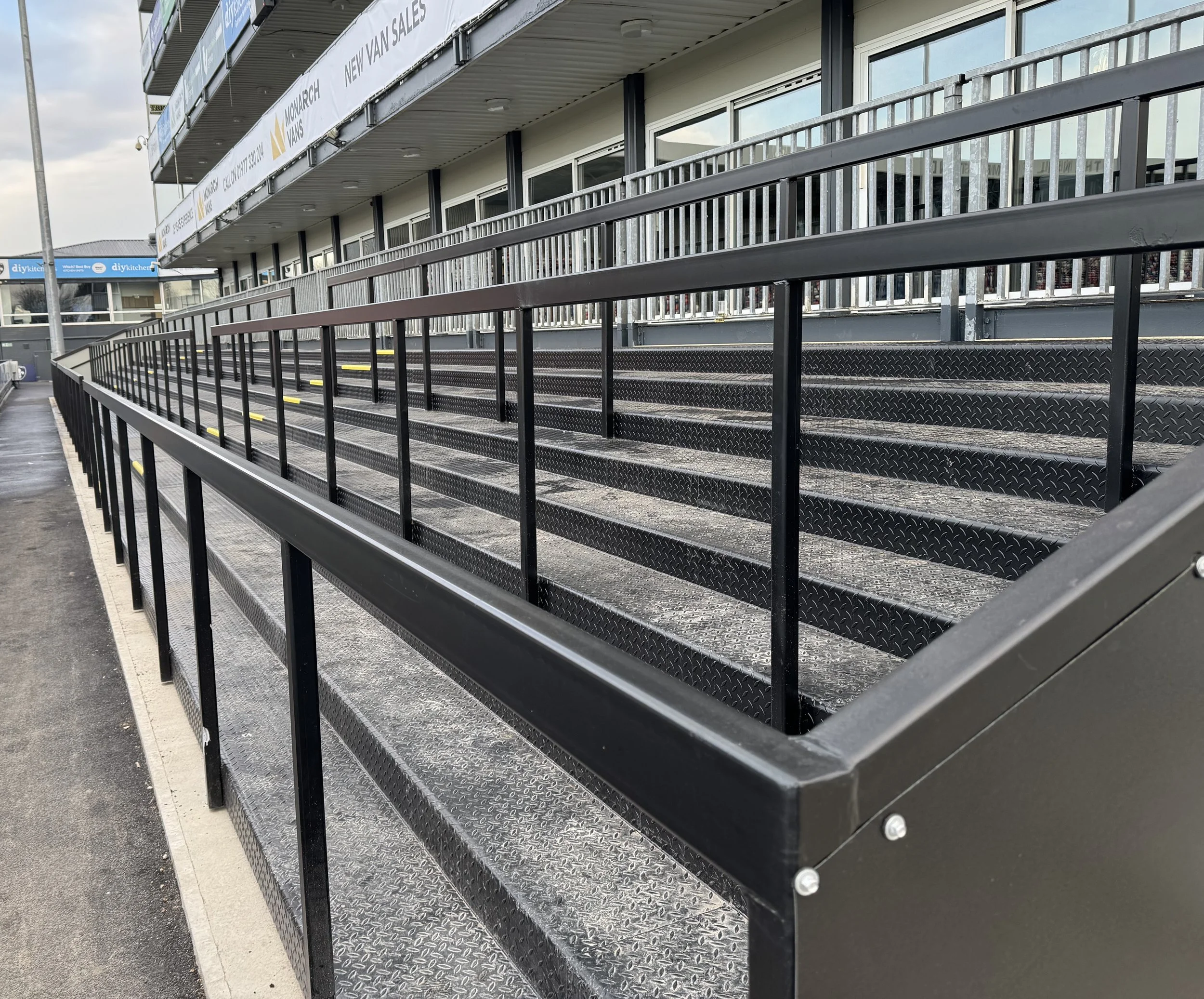 Crush Barriers – On our standing structures, these are 50mm x 50mm uprights and 50mm x 100mm horizontal top bars that have been tested to 2.4kN and are placed in accordance with the Green Guide recommendations. Our steps can be made to whatever dimensions are required