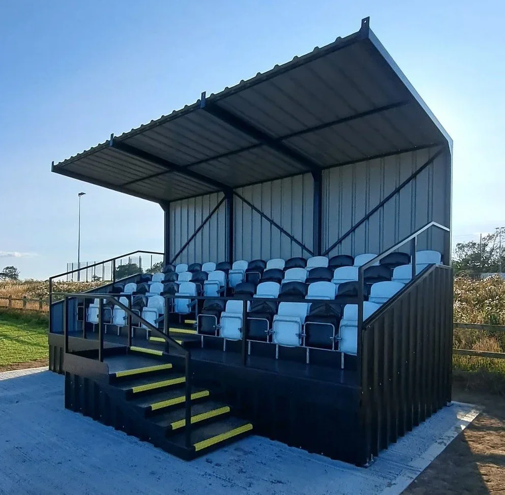 Fully Welded Cantilever High Grade Steel Structures. These are British designed & manufactured, including the seating complying to a minimum of BS EN 210 as standard plus BS EN 1090 EXC 3